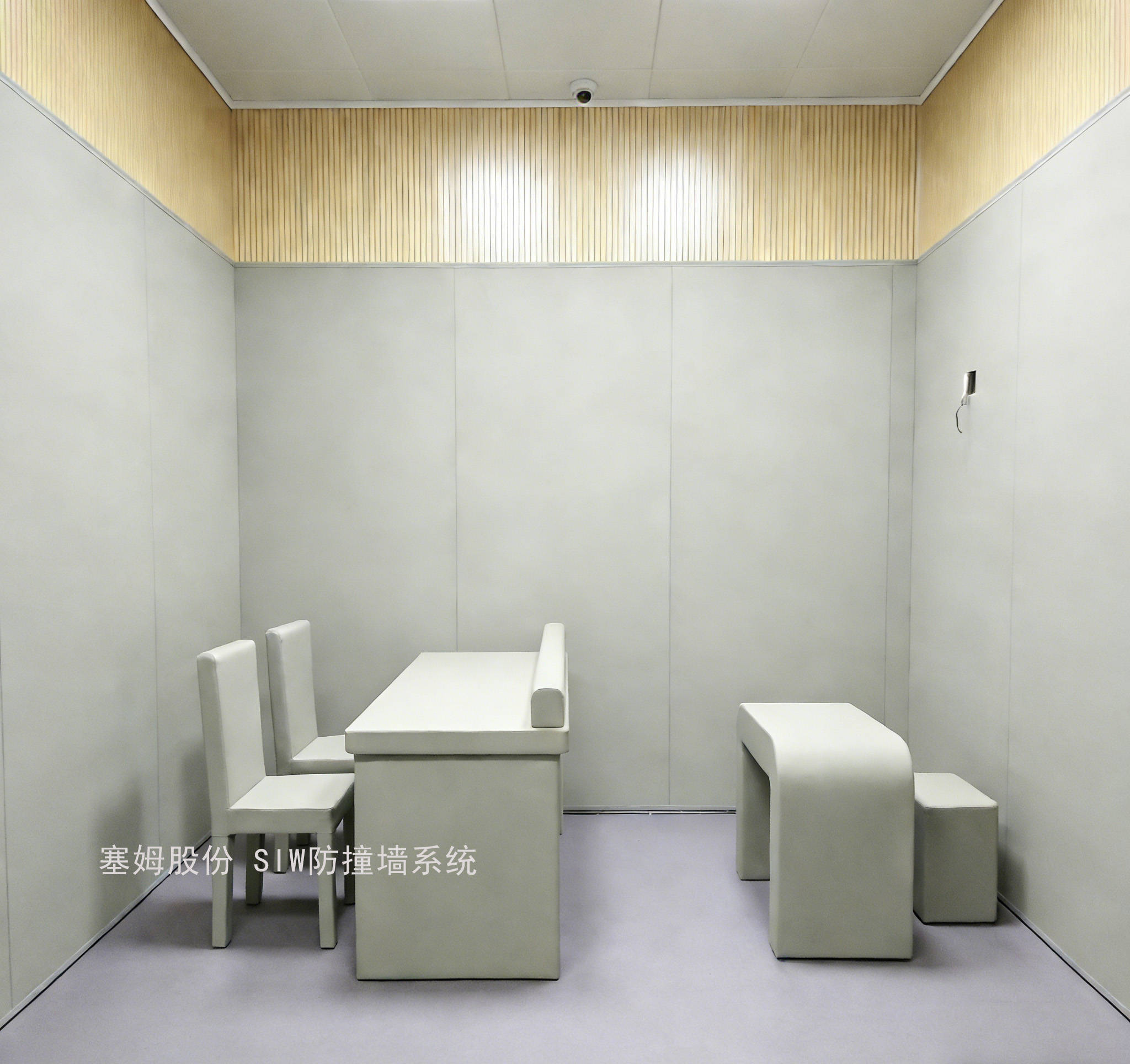 除了核心的防撞、防火、环保性能,塞姆股份还从实际应用场景出发,对产品进行全方位的优化升级,让安全防护与人性化、实用性完美结合。考虑到公安审讯室、留置场所等场景对隔音降噪、空间适配的需求,SIW防撞墙系统采用多孔结构设计,能有效吸收声波、减少回音与噪音传播,营造安静的执法与监管环境;同时提供20mm、25mm、30mm等多种厚度选择,配合无胶复合皮革饰面与软质硅胶收边条,实现无缝拼接安装,既避免了缝隙藏污纳垢,又能根据不同场所的空间尺寸、装修风格进行定制化适配,让墙面既安全又整洁美观。针对特殊场所使用频率高、维护难度大的特点,塞姆股份独创高温火附无胶复合工艺,将阻燃皮革与基材高温熔合,彻底消除胶水污染的同时,大幅提升材料的耐刮擦、抗磨损性能,产品使用寿命长达10年以上,日常污渍只需简单擦拭即可清洁,极大降低了场所的后期维护成本。