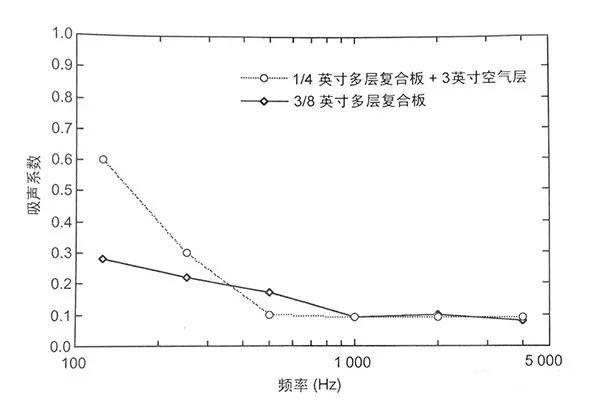 共振式吸声结构与多孔吸声材料形成了互补。共振式吸声结构的最强吸声频率与板后的空气层以及面板的有效质量有关,单位面积面板质量直接决定有效质量,面板越重或空气层越厚,共振频率越低。