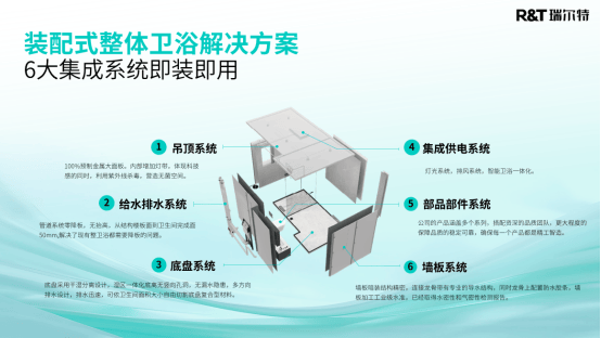 针对传统卫生间改造流程繁琐、周期长的痛点,瑞尔特创新性地提出了 “以无障碍升降系统为核心的整体装配式适老卫浴解决方案” 。该方案将复杂的卫浴空间化繁为简,通过集成供电、墙板、底盘、吊顶、排给水、部品部件六大系统模块化预制,实现施工现场即装即用,极大提升了改造效率,降低了用户的时间与精力成本,为家庭、养老机构、医疗机构等提供了高效、可靠的整体卫浴焕新选择。