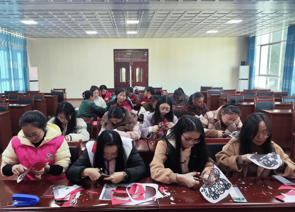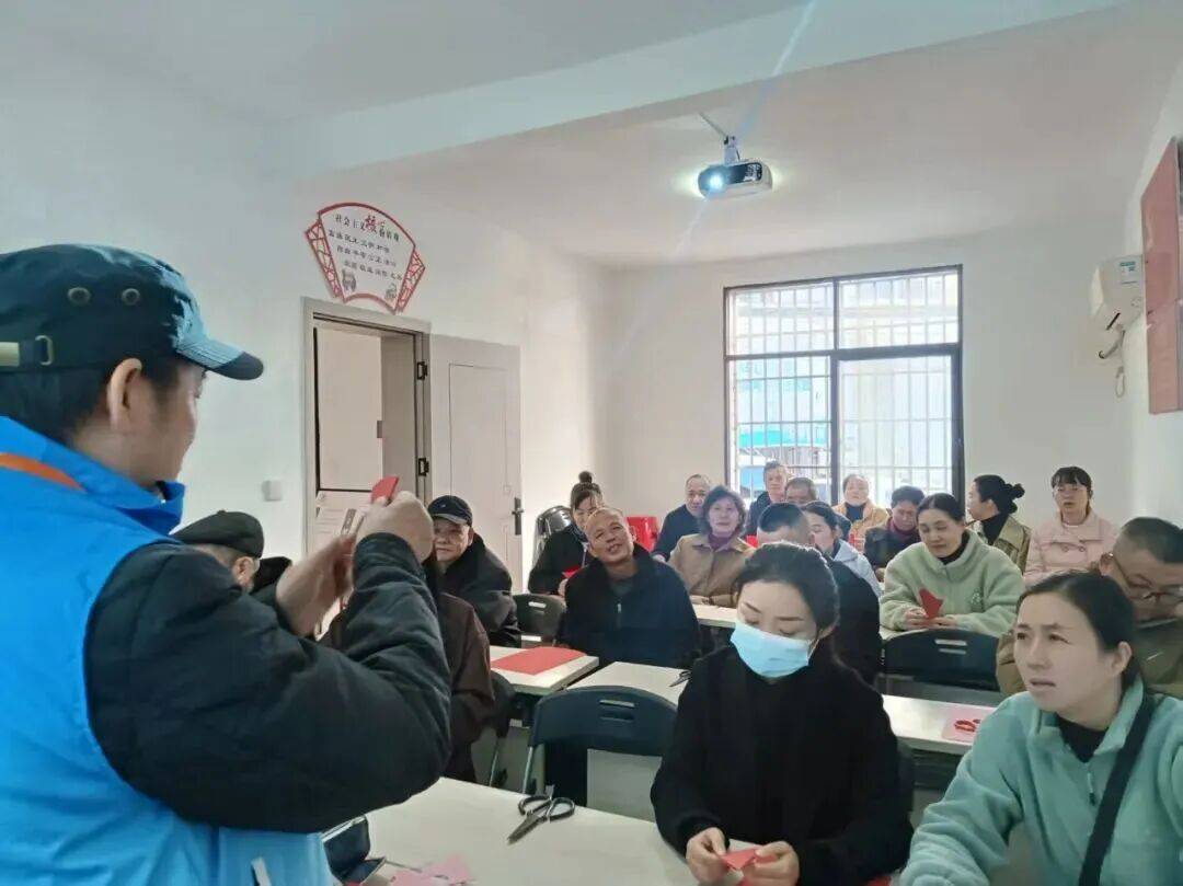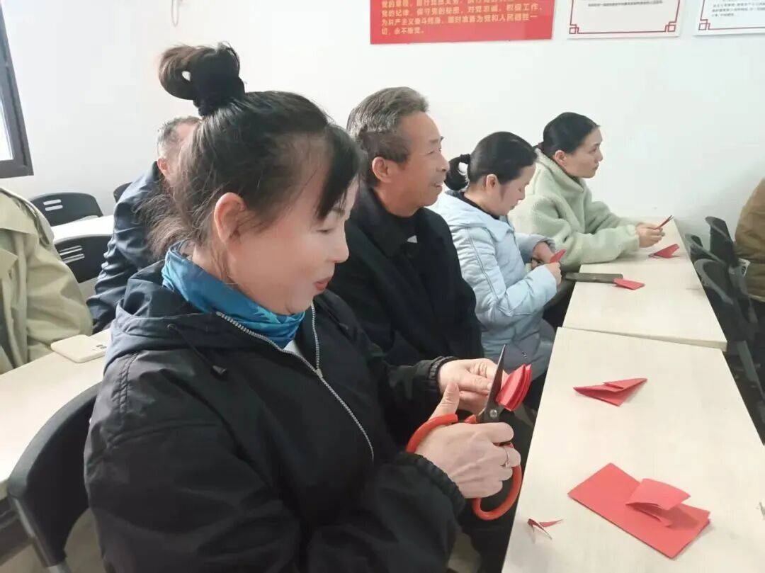 活动现场,马老师先用通俗的语言介绍了剪纸的历史和基本技巧,结合章庄乡的特色环境,展示了多幅以竹子、农家生活为主题的剪纸作品,引得大家连连称赞。互动教学环节,大家热情高涨,纷纷拿起剪刀和红纸跟着学习。马老师穿梭在人群中,手把手指导大家掌握对折、剪轮廓的技巧,耐心解答“怎么剪得对称”“图案怎么设计”等问题。现场“咔嚓咔嚓”的剪纸声不断,大家互相交流、互帮互学,气氛十分热烈。