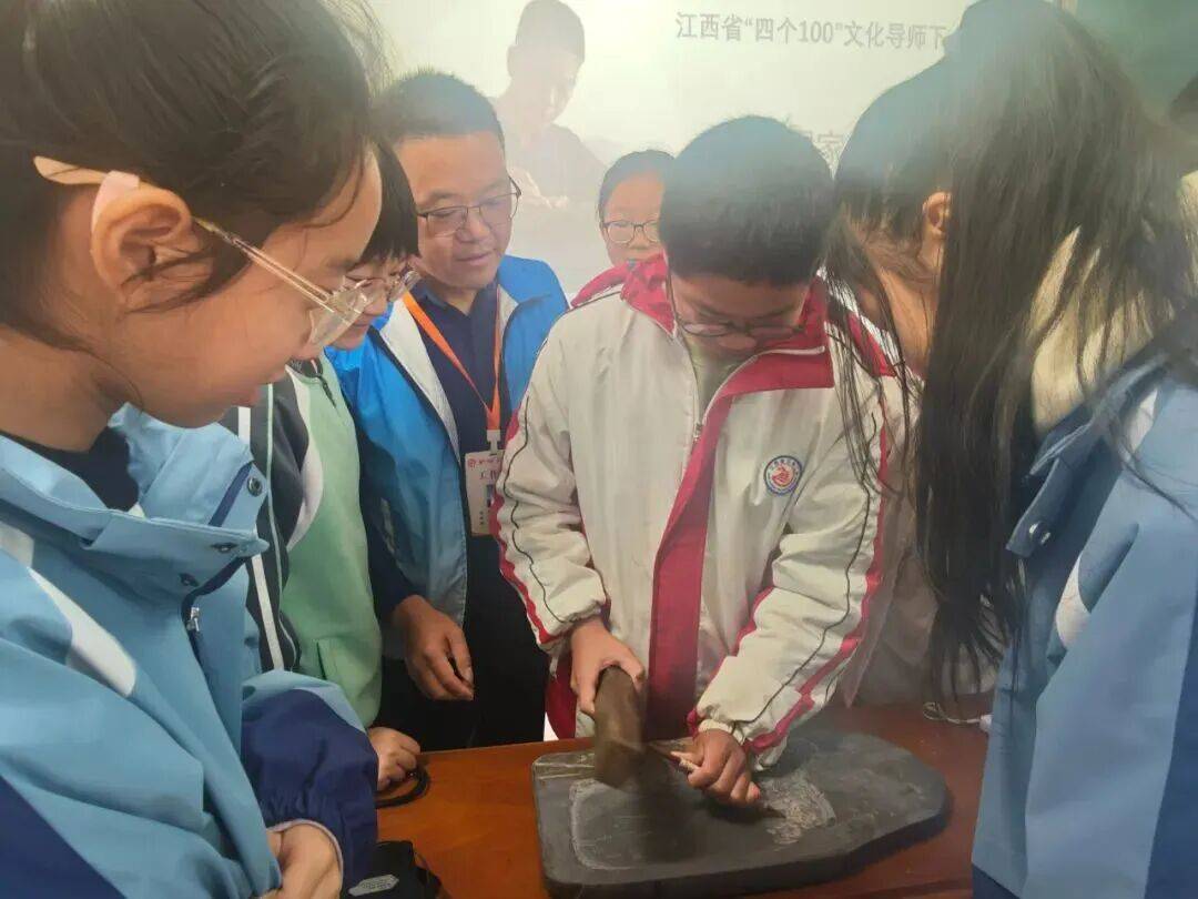 活动现场,非遗导师江小坤为同学们带来了一场精彩纷呈的非遗讲堂。江小坤介绍了石城砚的历史源流、石材特性讲到雕刻工艺,并结合其多年的坚守与创新故事,将一块石头所承载的文化底蕴与匠心精神娓娓道来。展演环节,同学们近距离观摩了石城砚江老师巧手之下,从粗粝石材到温润砚台的打磨雕刻过程。体验环节,学生们触摸砚石原料,并在江老师的指导下,临摹经典砚台纹样。
